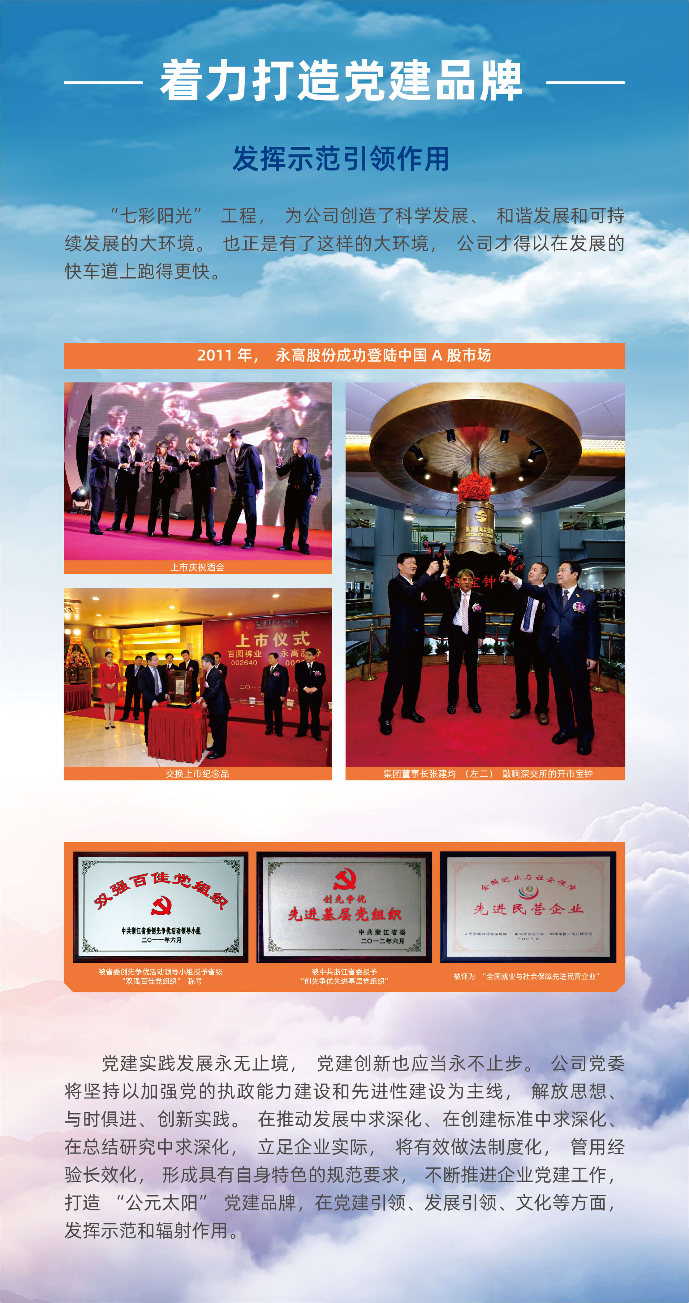 公司自创建之初,创始人张建均先生始终坚持党的领导,十分重视德扑排名文化 和文明创建工作,着力提升企业文明水平和员工文明素养。经过近30多年的沉淀、积累和发展,已经形成了独具永高特色的党建和德扑排名文化 体系,在全国行业领域和省市区发挥了积极的示范作用和品牌效应。